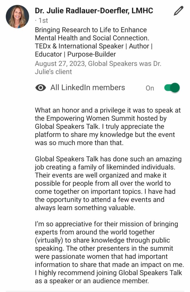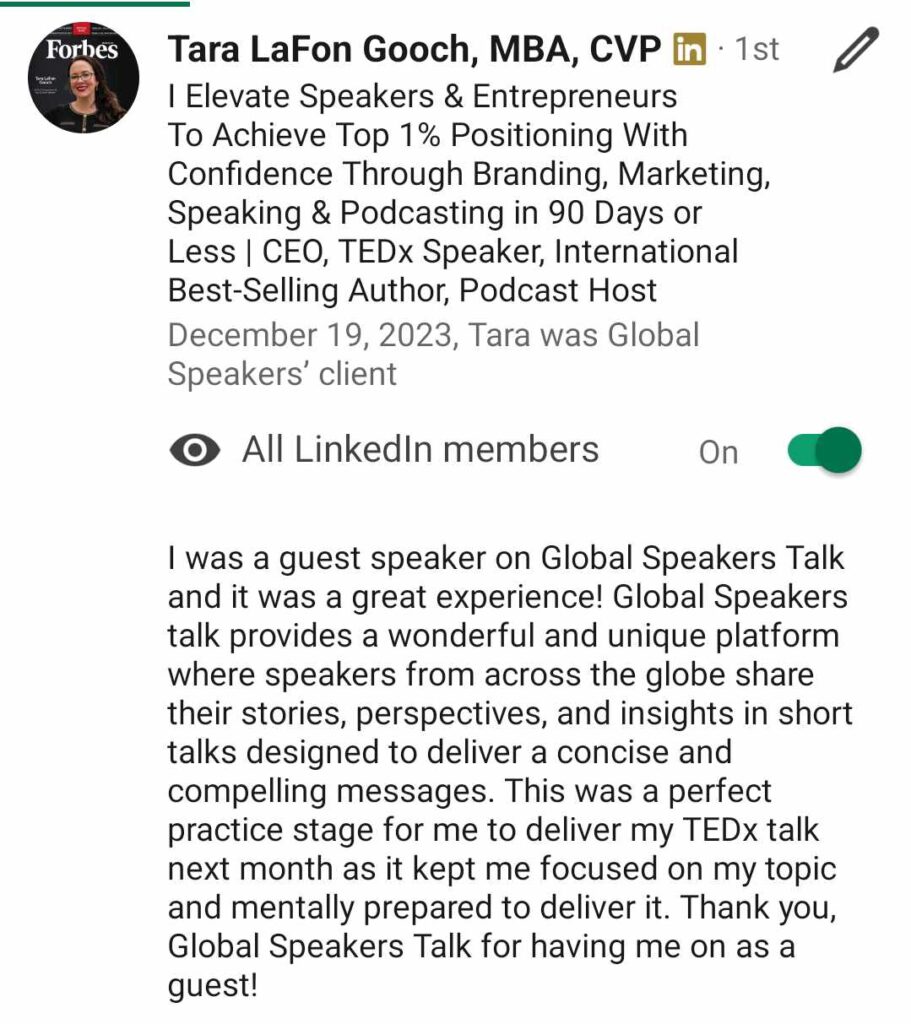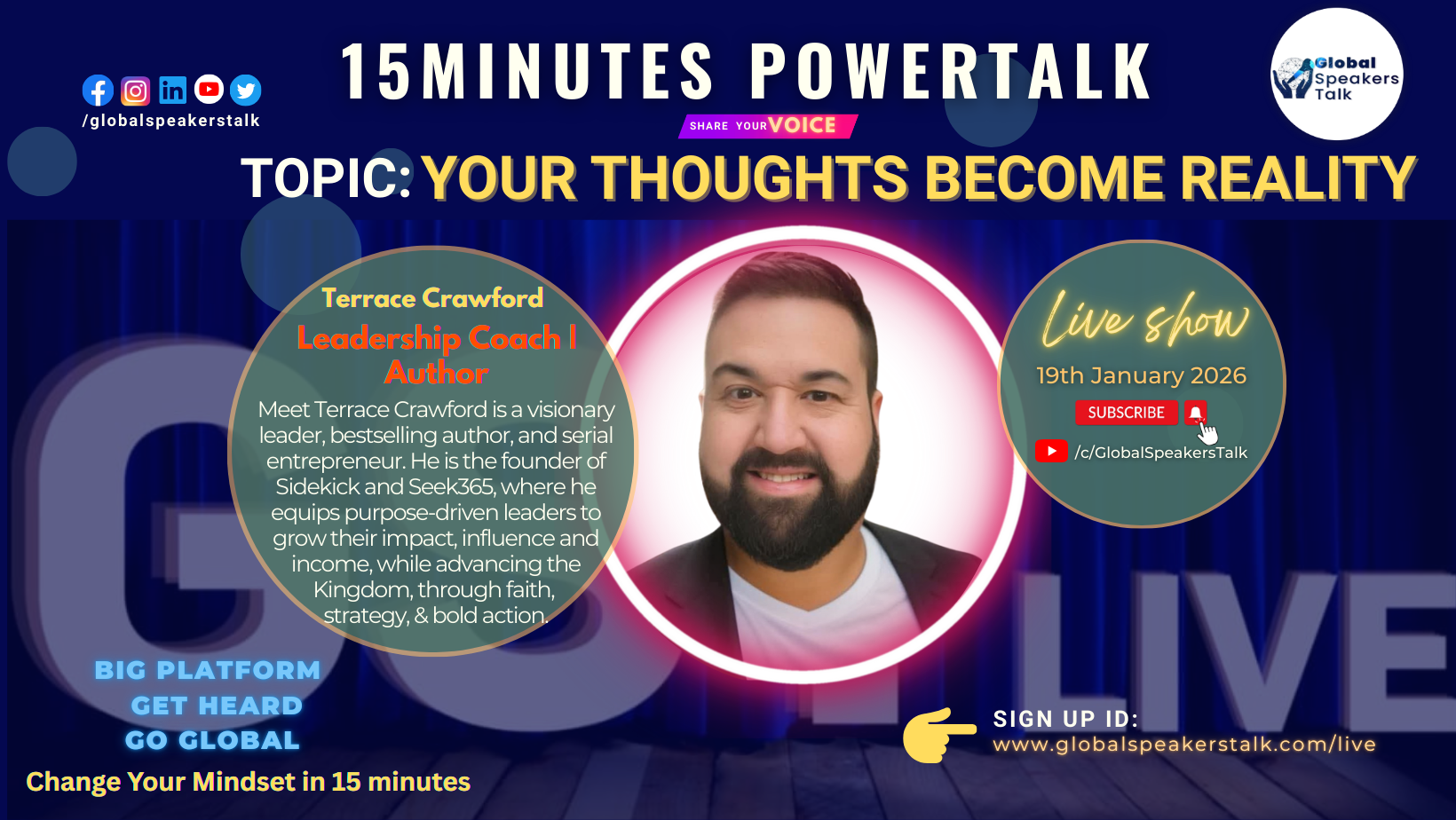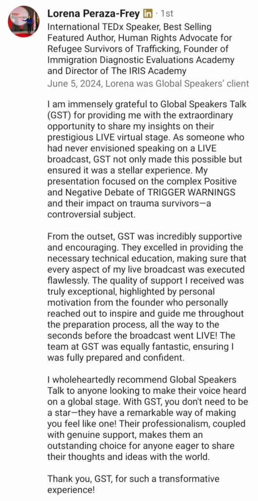 Global Speakers Talk is the world’s fastest-growing virtual stage empowering speakers, coaches, authors, entrepreneurs, and changemakers to share their message, grow their influence, and impact millions worldwide.