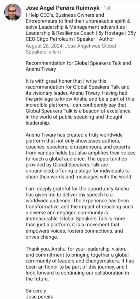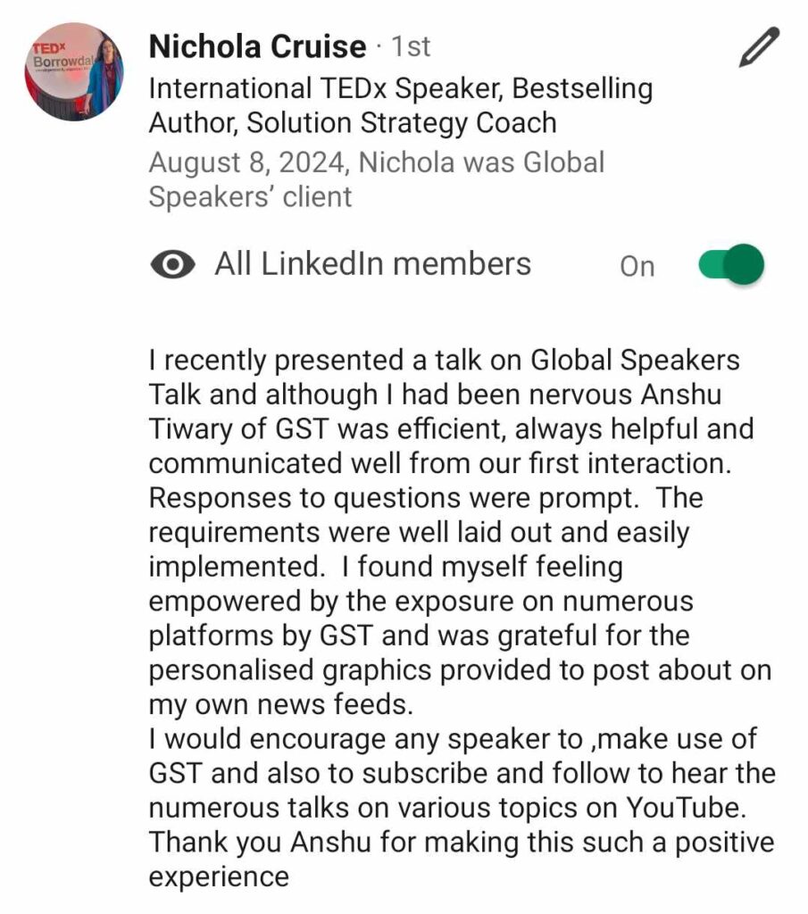 Founded by Anshu Tiwary, Global Speakers Talk is a global speaking ecosystem dedicated to amplifying unheard voices, purpose-driven leaders, coaches, entrepreneurs, authors, and changemakers from every corner of the world.